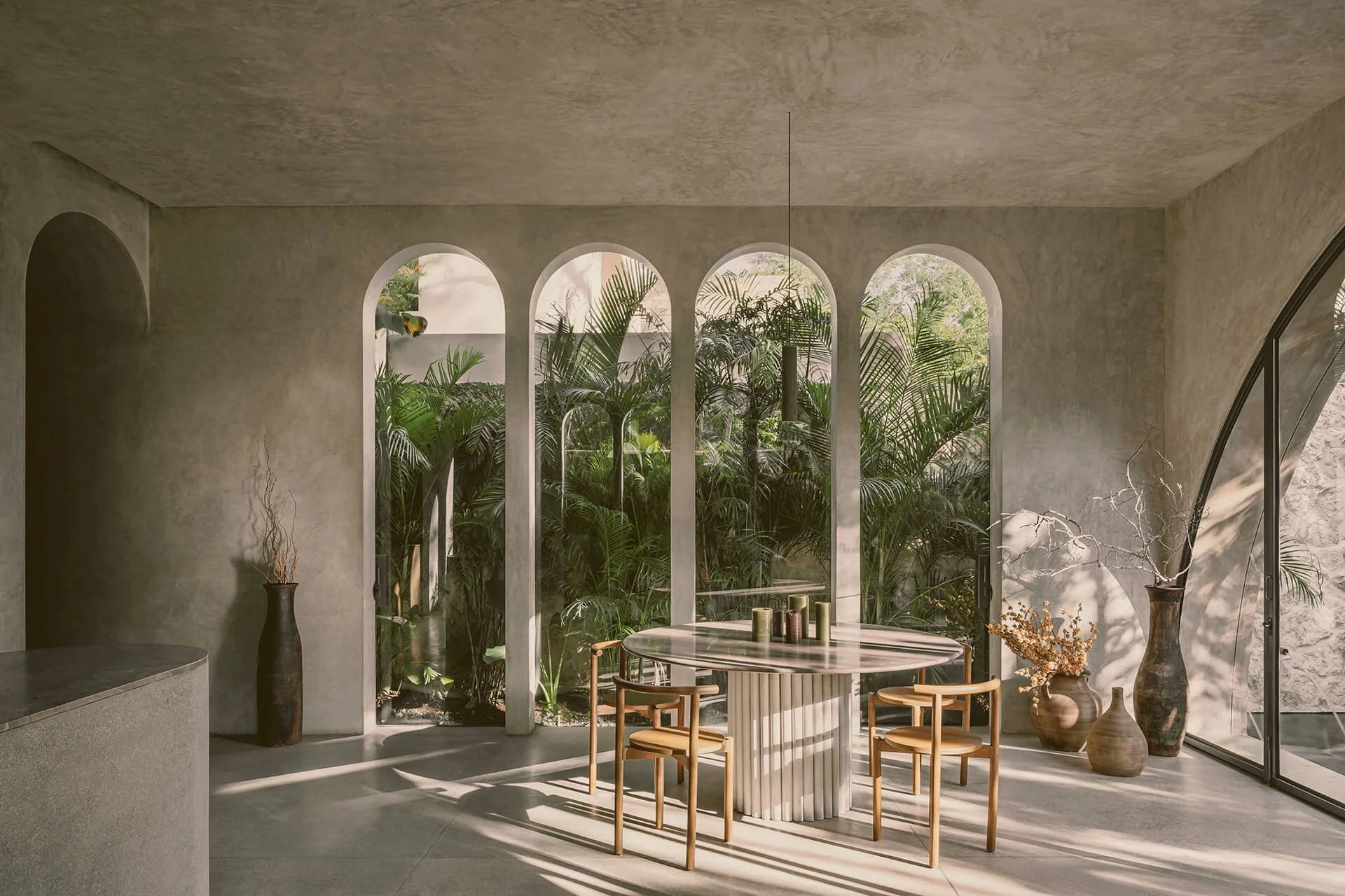 Archways are a distinctive feature in Modern Mexican design, adding a touch of elegance and softness to the interiors. These curved lines create a sense of flow and continuity, leading the eye through the space and adding architectural interest. Whether framing doorways, windows, or alcoves, archways bring a unique and graceful element to the design.