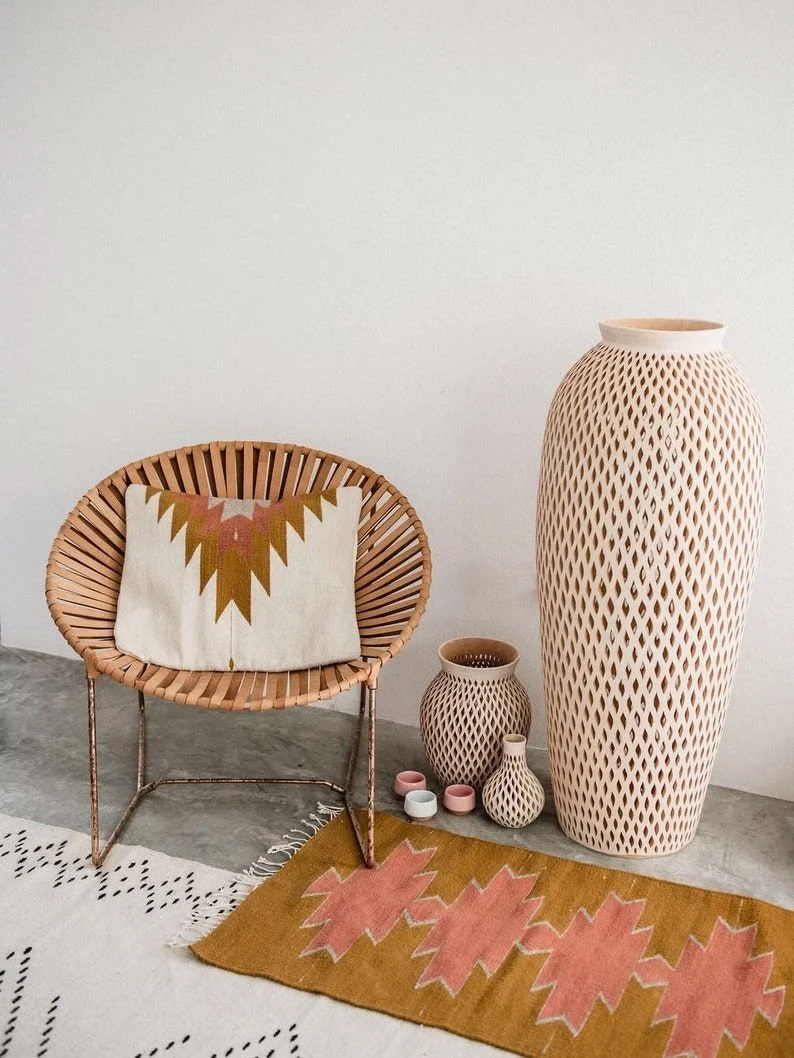 Woven elements are a hallmark of Modern Mexican design. Hand-loomed Zapotec rugs, pillows and blankets should adorn every room at least once. Handcrafted wicker furniture and baskets also showcase the rich artisanal heritage of Mexico and come in a variety of colors that lend texture and intrigue to a room. They also bring a sense of authenticity and craftsmanship to the space, celebrating the hands that made them.