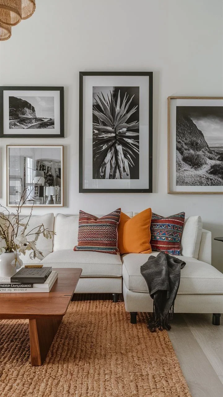 A modern Mexican living room that combines a neutral color palette with color accents